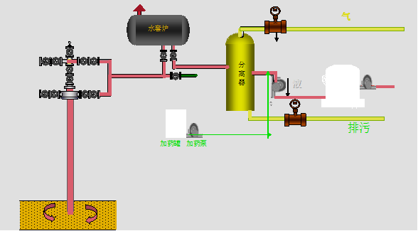 原油脫硫一般采取直接注入原油中, 在三相分離器后加藥,設(shè)備需要一臺(tái)注入泵和一個(gè)分散器或霧化器裝在管道中央。上游的注入點(diǎn)和下游的接受器之間要有足夠的距離,以確保有充足的反應(yīng)時(shí)間,處理后原油逸出H2S的指標(biāo)低于10PPm以下。生成產(chǎn)物一般為多硫化合物鹽,性能穩(wěn)定,經(jīng)過(guò)聯(lián)合站破乳脫水后,隨污水排出。工藝流程如圖下: